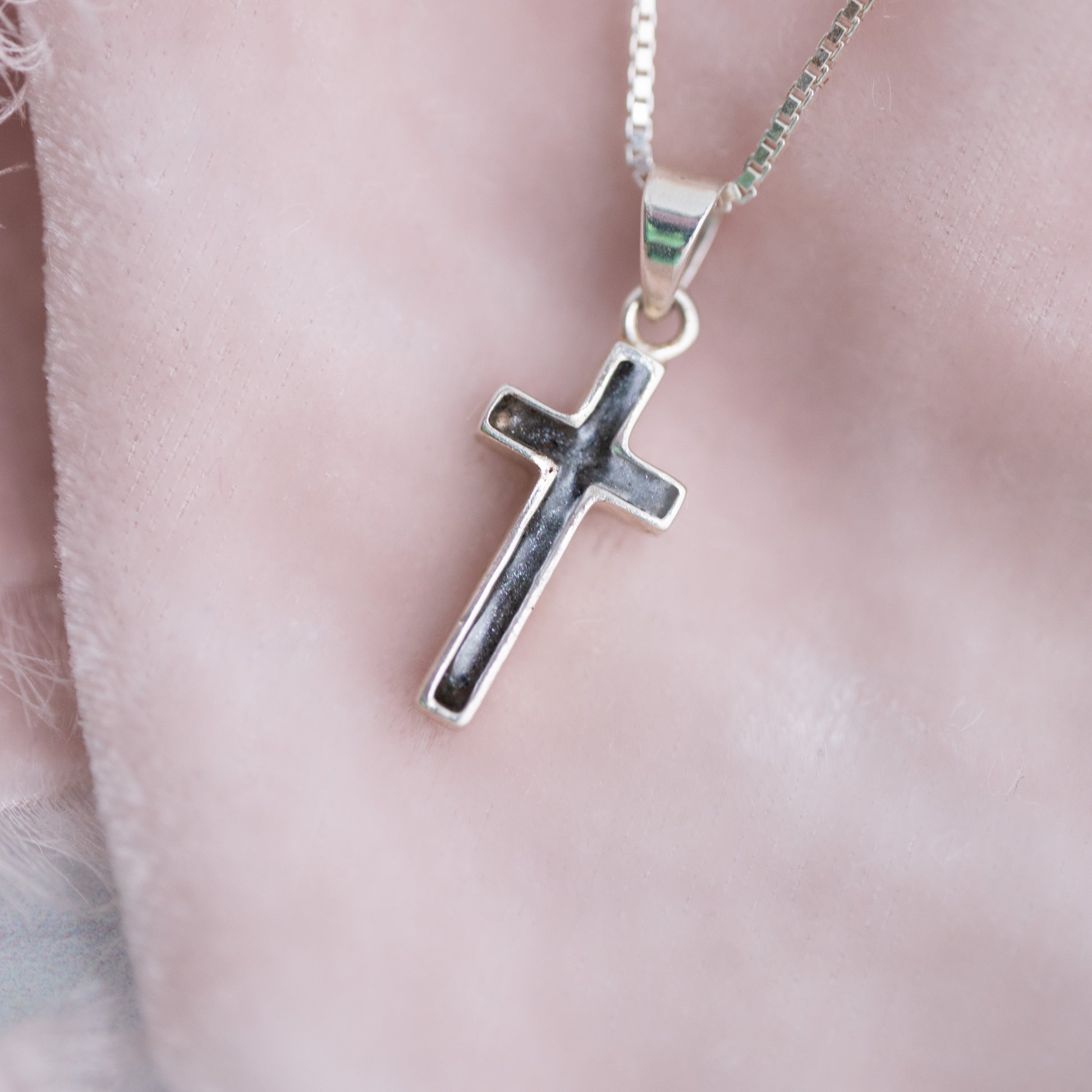 Celebrate the memory of your loved one with this timeless mini cross pendant, designed to be both elegant and deeply meaningful. The front of the pendant features a hand-set inlay made from your chosen inclusion such as cremation ashes, preserved wedding flowers, or any other cherished material. Each piece is carefully crafted to preserve a lasting connection, offering you a beautiful way to keep your loved one close to your heart.