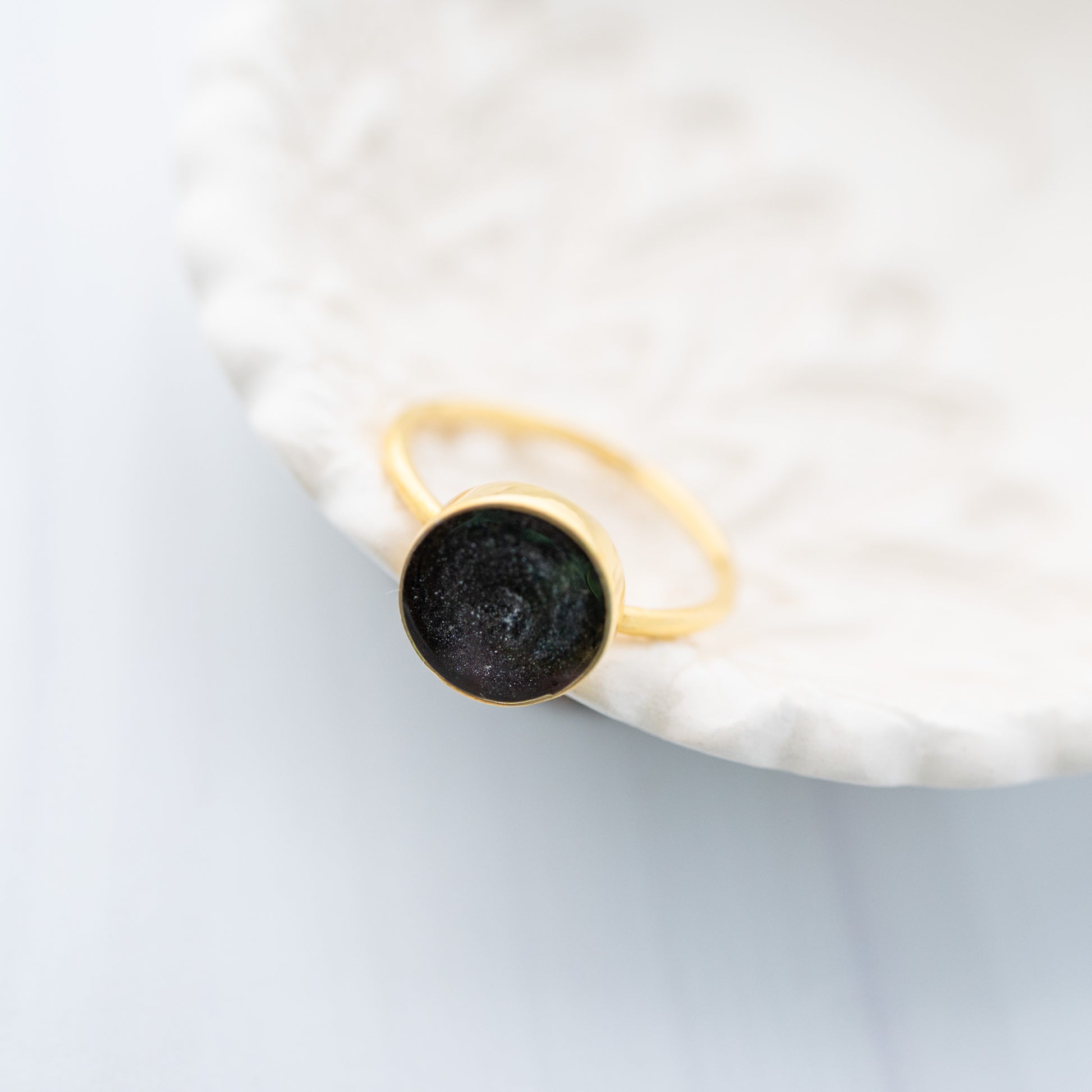 Timeless and minimalist, this simple ring features a smooth, round bezel setting that’s ready to be filled with the inclusion of your choice—such as cremation ashes, preserved flowers, or other meaningful materials. With its clean lines and delicate band, this ring offers a refined yet understated way to carry a memory close.