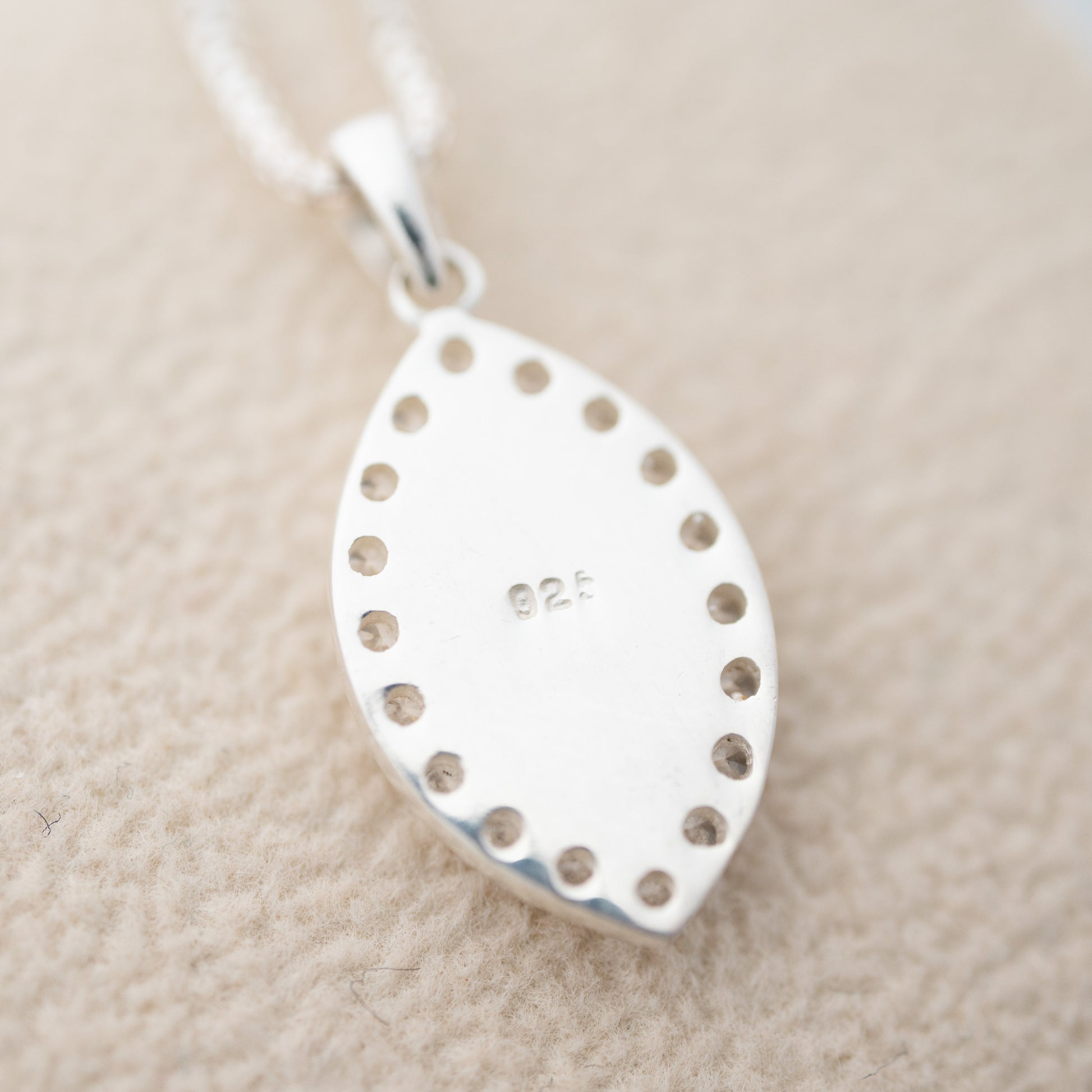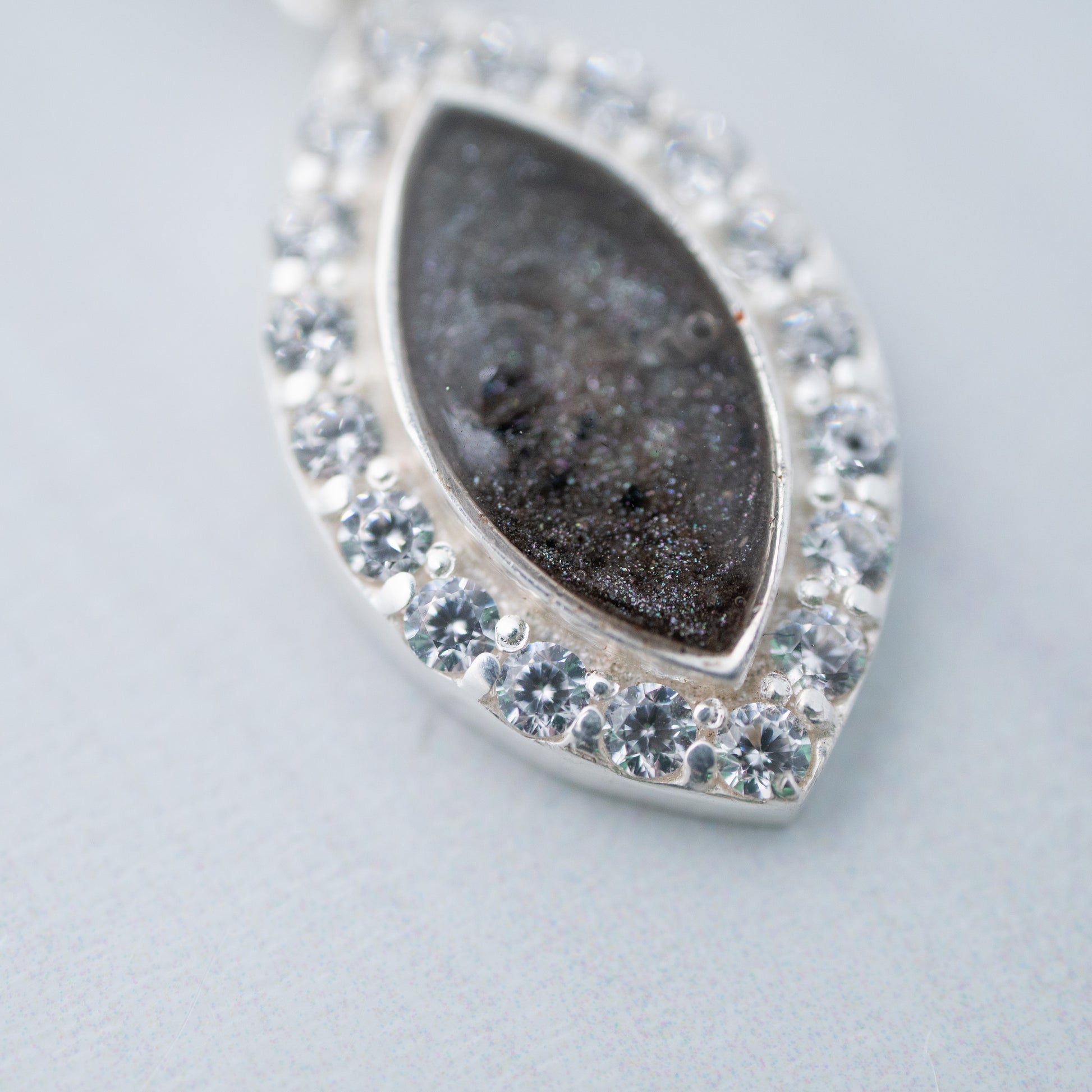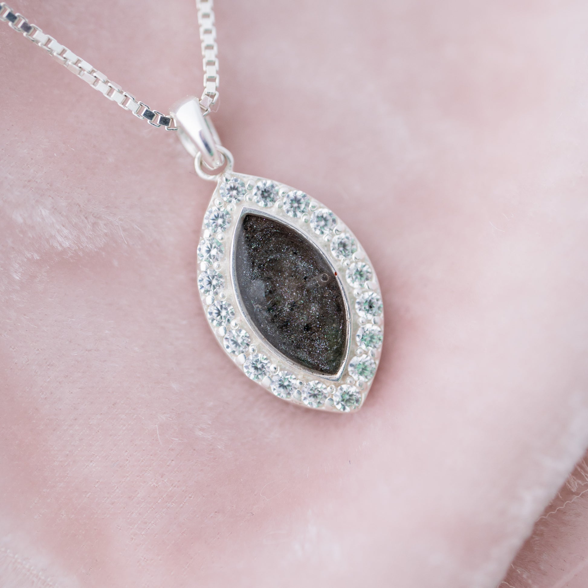 Timeless and refined, this necklace features a marquise-shaped bezel pendant, elegantly framed by sparkling zircon accents. The blank bezel is ready to be customized with a meaningful inlay—such as cremation ashes, preserved wedding flowers, or any other cherished material—making it a beautiful way to celebrate love, memory, or a special moment in your life.