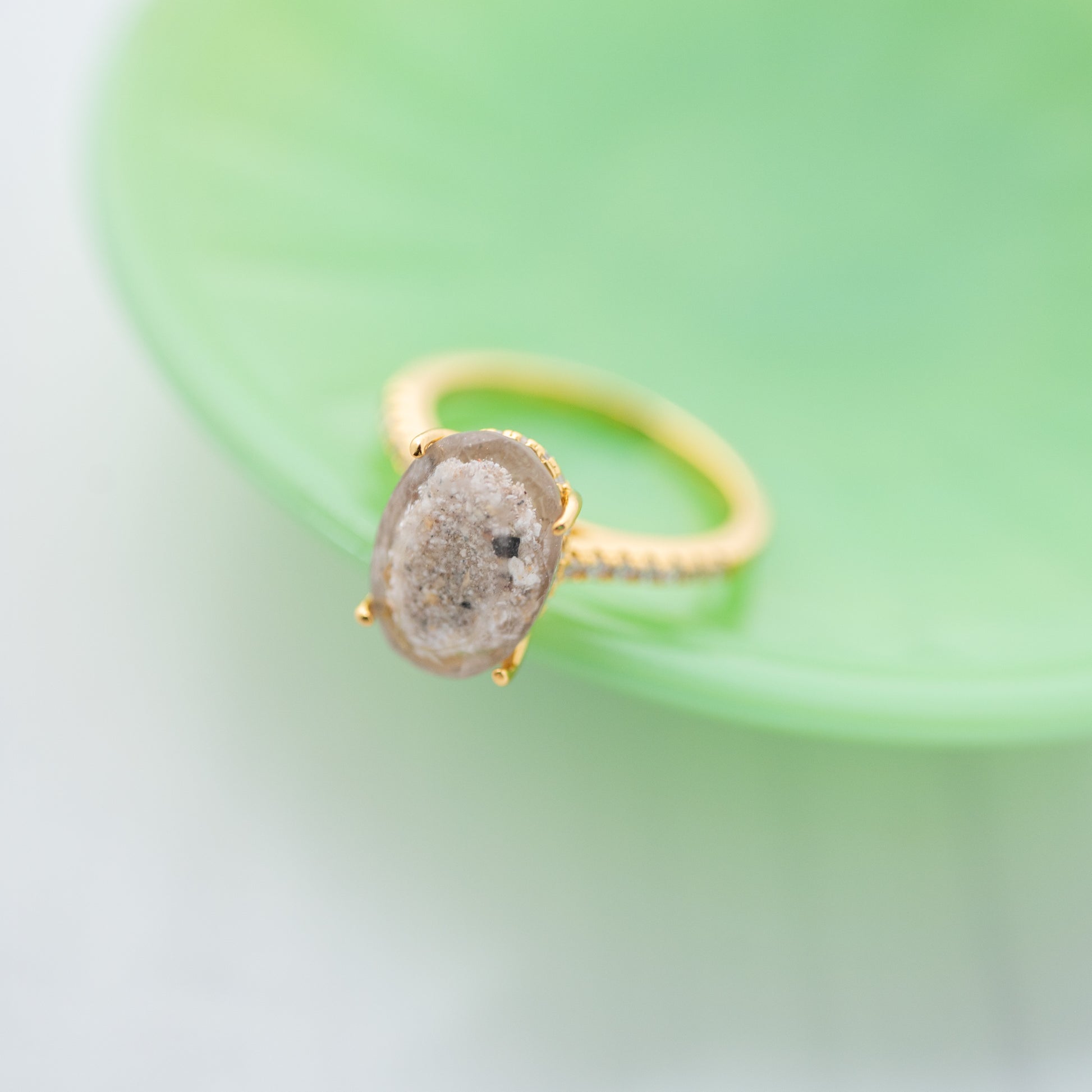 This elegant ring features a classic oval bezel setting, surrounded by a delicate halo of sparkling zircon accents. The thin, pave-set band adds a touch of brilliance while keeping the design timeless and refined. Available in both silver and gold finishes, this setting is perfect for creating a one-of-a-kind piece with your chosen inclusion—such as cremation ashes, preserved flowers, or other sentimental materials.